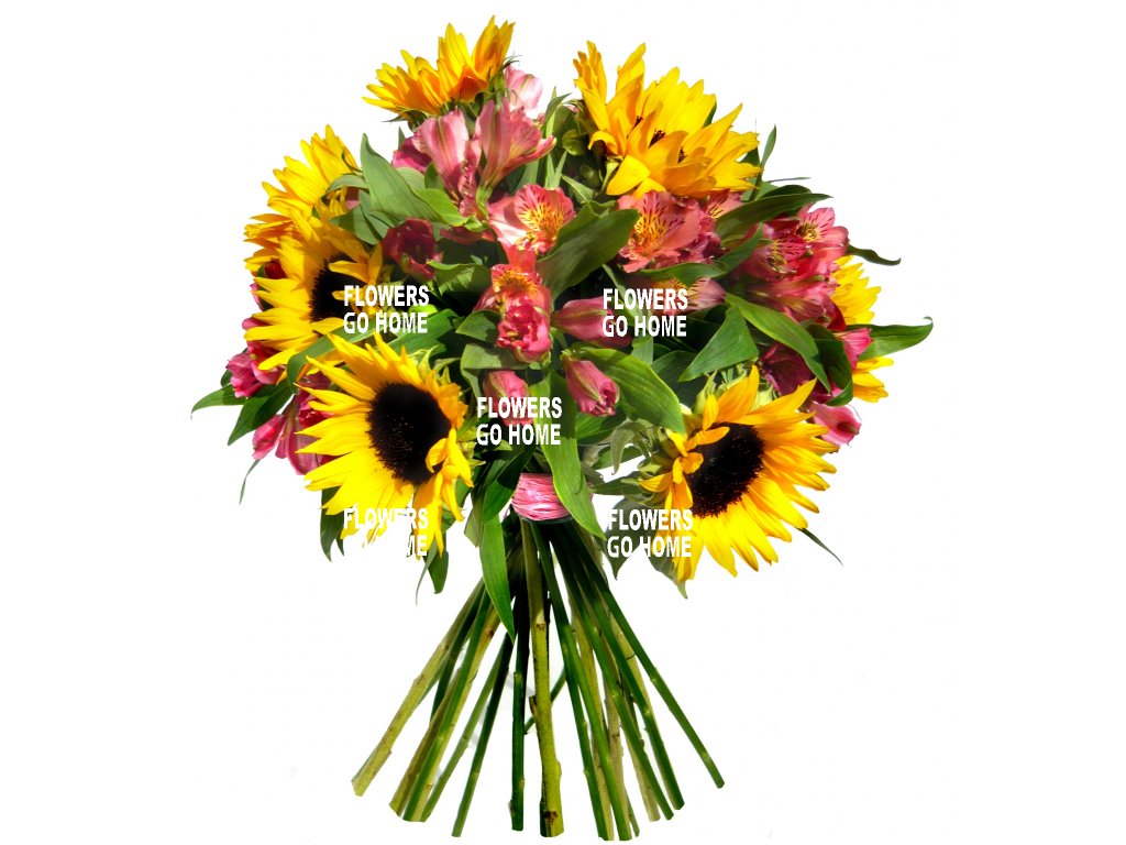 STŘEDNÍ: | Slunečnice 9ks, alstromerie 11ks, stuha |
