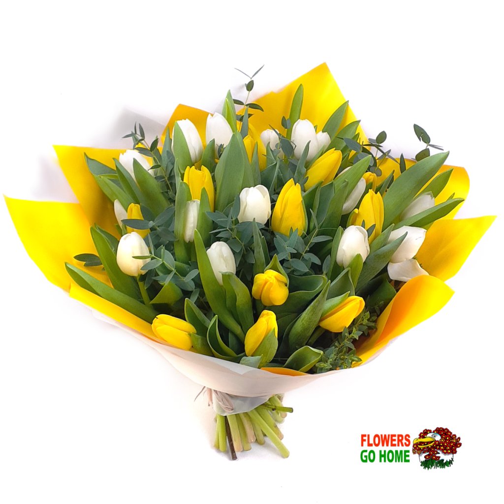 Žluté tulipány symbolizují radost a přátelství, zatímco bílé vyjadřují čistotu a nevinnost. Společně vytvářejí dokonalou symbiózu barev, která okamžitě přivolává atmosféru štěstí. Eukalyptové listy dodávají kytici svěžest a jemnou vůni, čímž vytvářejí zážitek pro všechny smysly.